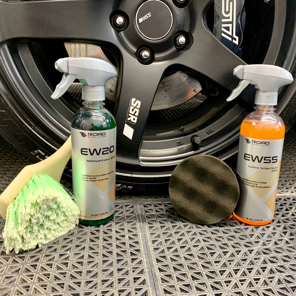 Cet ensemble, incluant les produits de nettoyage et les accessoires, est parfait pour le nettoyage de vos jantes. Grâce à la combinaison du lustre pour pneu EW55 et de l'applicateur AE64, vos pneus brilleront d'un fini noir lus...